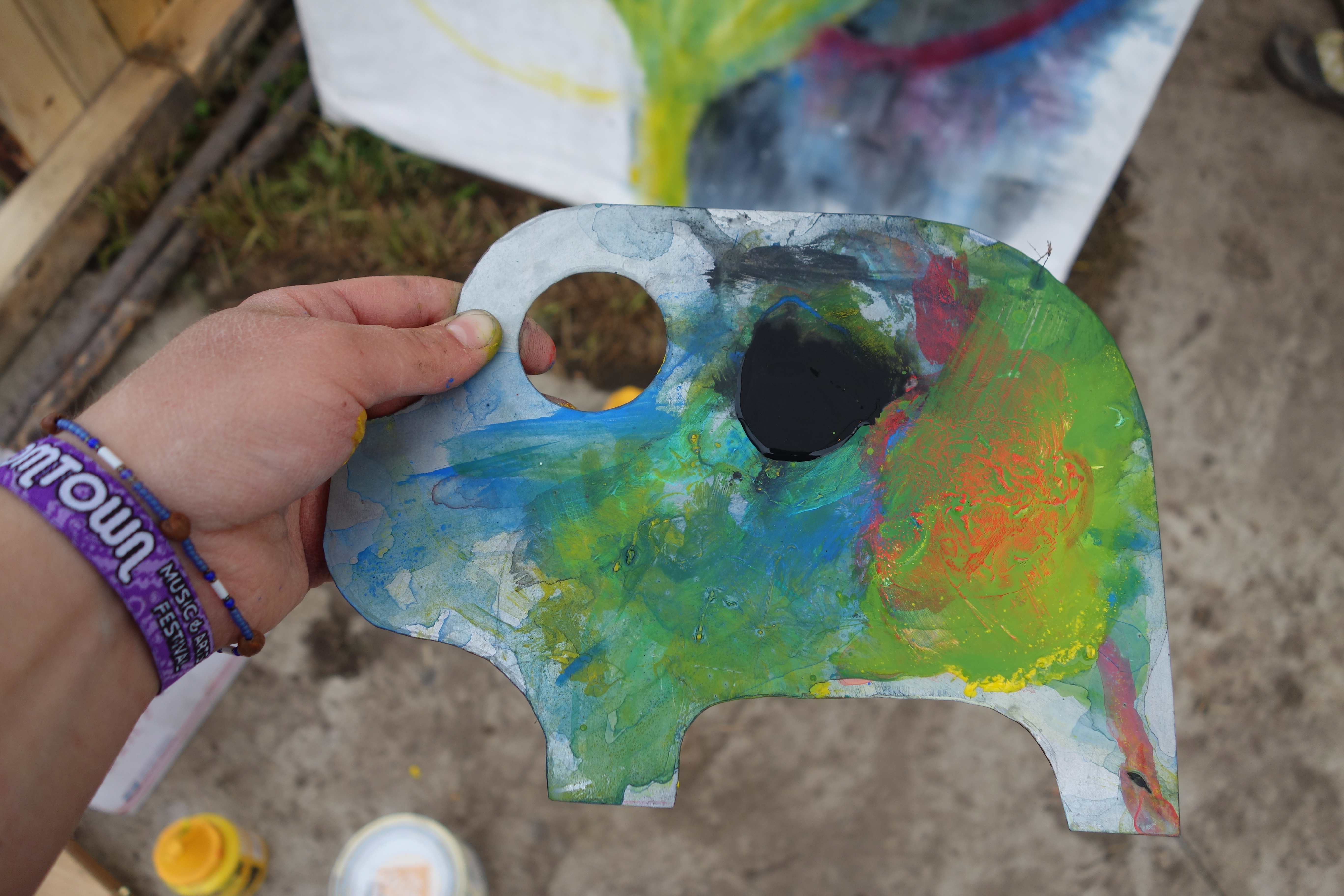 I arrived back at the music festival, and was welcomed by the friendly faces of my new friends, and a mud pit. I drove straight into the mud pit while looking for parking in my change of vehicle. It is a good thing to be friends with the owners of the festivals at times like those. I was pulled out of the muck hole by one of the owners of the property with the aid of his bobcat. I hadn’t yet met him, but I knew his brothers and his mom and I feel it was quite the bonding experience. I was tired from my adventure of the day, and the ride through the cool rain. I had painted the street and so my artistic intellect felt tapped. I made a conscious decision to not live paint, and instead chose to hang around, stay up late, and talk with friends, the way I usually do when I’m not working a music festival. I knew that more work welcomed me Monday.