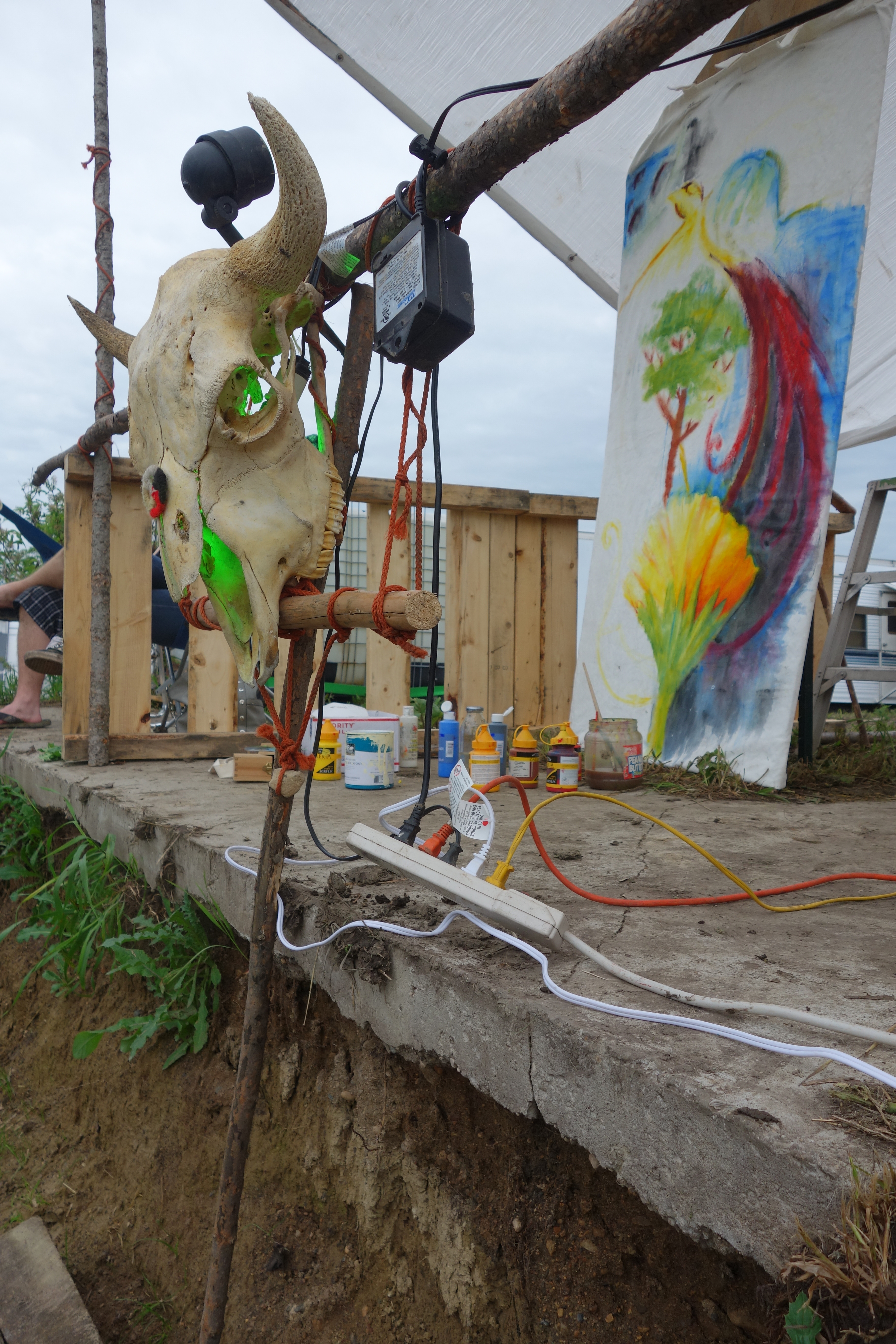 My first leg of this two week working stint started with a finishing up a grant proposal. I currently have  a pretty awesome project in mind, but I am searching out funding (details after the chickens have hatched). I turned in the grant, hopped on Little Wing, and rode to the next leg of my two week adventure; a music Festival in Waubun, MN. I was to do live art at the festival, as well as help setup, since I wouldn’t be available to tear down. I showed up a couple nights before the actual festival and I was pleased to find work painting signs in preparation. When that got boring I switched over to helping put up fences and and other random chores. The best part about the volunteering to help set up wasn’t the work, per say, it was the people I met doing so. People who volunteer to help with music festivals are usually a different breed, and I felt as though I found at least a dozen, new, best-friends. The Music Festival actually started Thursday, and that’s when I got to put paintbrush to canvas, and the meeting of cool people had only just begun.