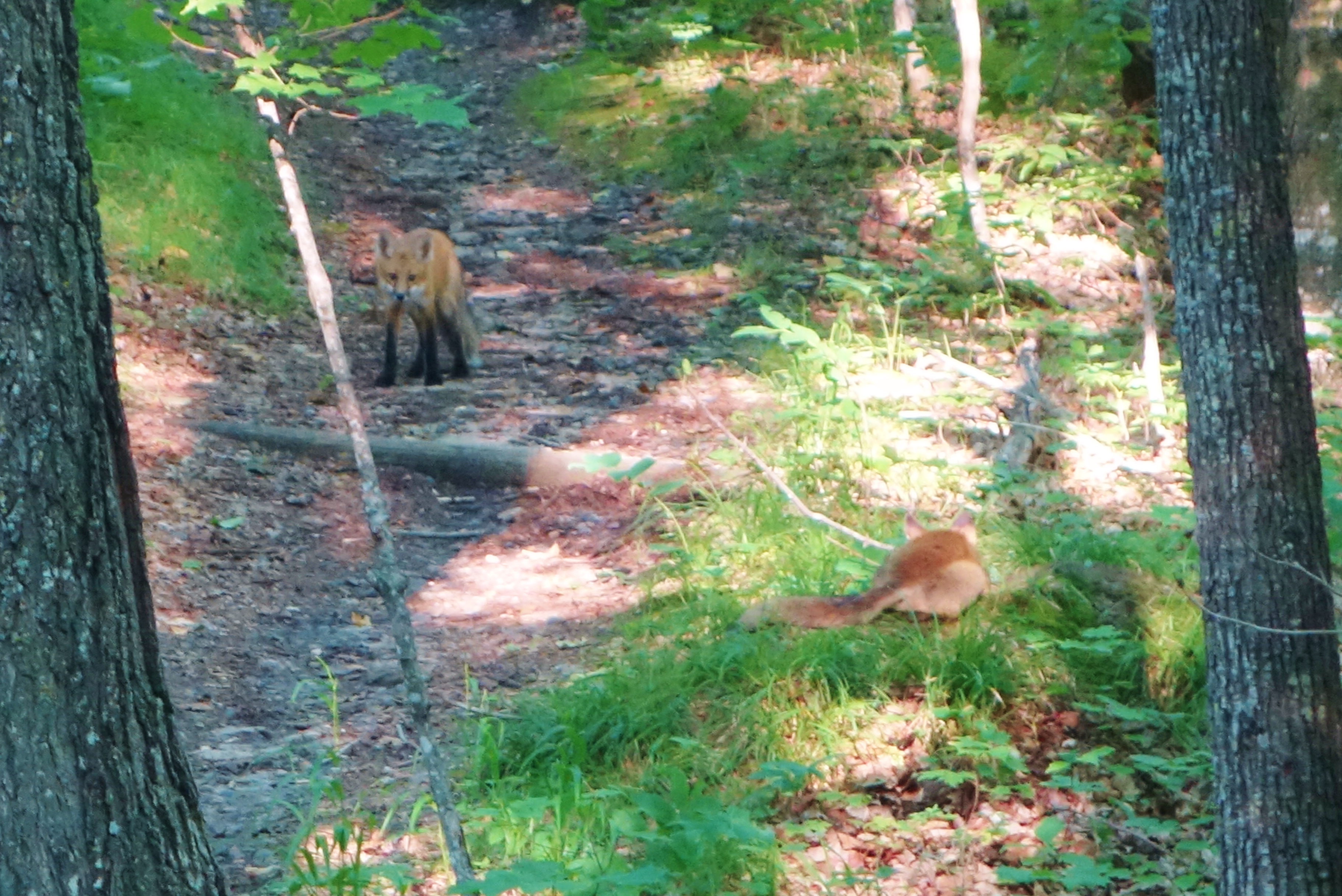 I was in the lead, and I was the first to spot them. I wondered what kind of a dog it was and as I moved my head the slightest bit to point the critter out to my companions another one popped out, and I realized. “Shh, shh. Look, foxes.”