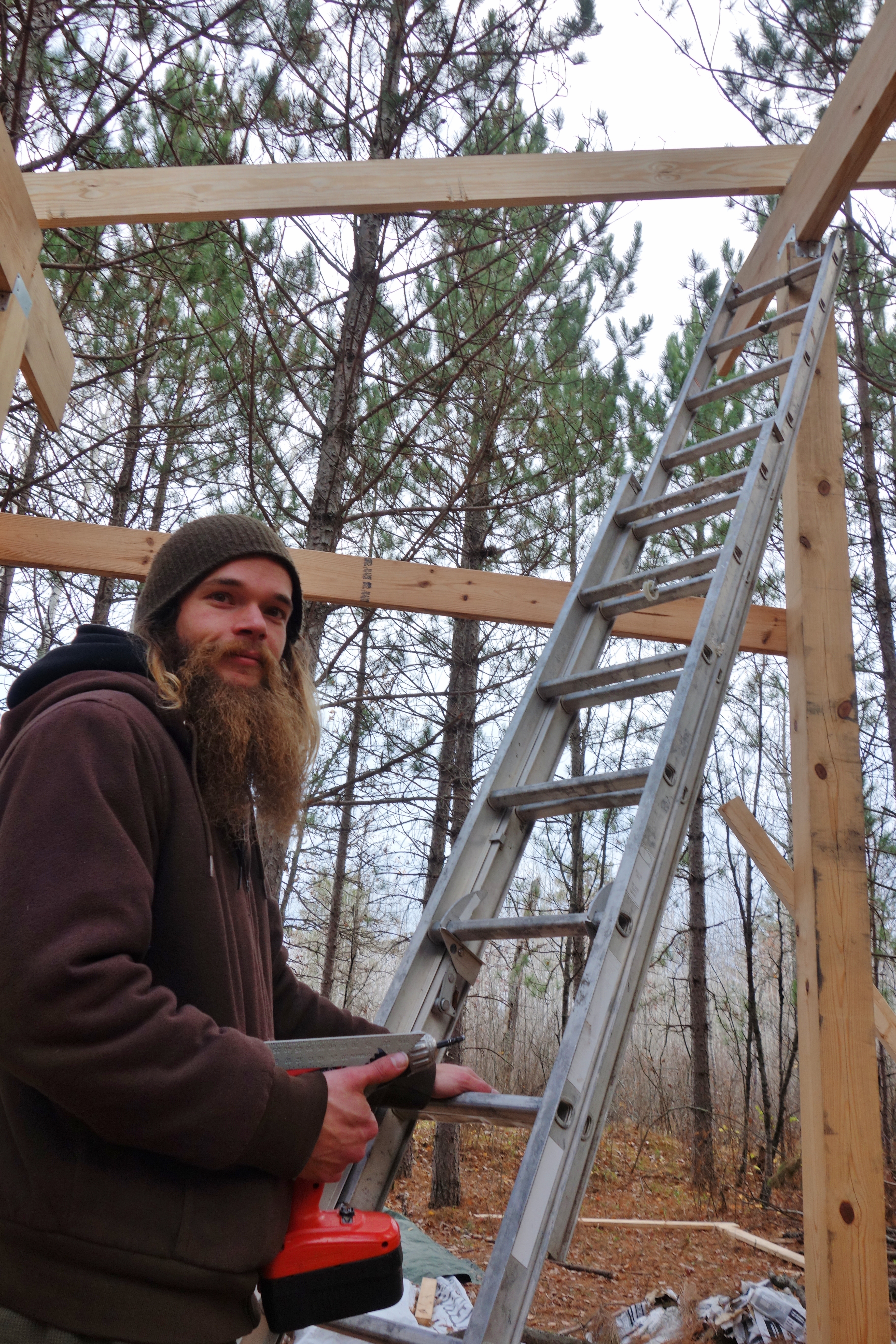 The next week we raised our attention from the floor to the roof. I was busy working, I work for Special Olympics Minnesota and the beginning of October was my Bowling season. While I was inside the camper, utilizing the newfangled wifi hookup we had, Cassidy was outside pushing very long beams up to the south side posts.