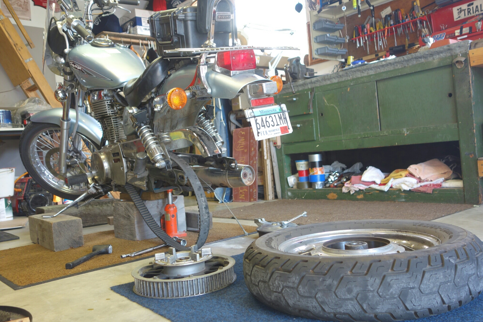 You might be wondering what the complication was with Little Wing. Well I have to rewind. After the art filled day spent with fellow artist and friend, David, I didn’t feel like wrenching. That was Thursday, and we got back to Chuck and Marilyn’s about five. It was late, I was tired from an over stimulated, art filled brain, so I decided to leave Little Wing for Friday. I had two voicemails on my phone. One telling me that my tire was done and my brake pads were in. The other telling me I had seals, an air filter, and an oil filter waiting at the Suzuki dealer. I decided to deal with it the next day. Friday morning was met with a great breakfast fixed by Marilyn, and supportive words from my two wonderful hosts. I pulled on my grub jeans meant for oil and grime, laced up my converse, and off I was to remove the valve cover. After some squeezing and jiggling I slipped it out through the small gap in between the head and the bike frame. I cleaned it up with carb cleaner and a scotchbrite sponge. I reported to Chuck, and we took off to pick up the parts. He let me drive the Mini, a zippy little car which I adore, and we made it to both shops and back in no time. We were met with another great meal from Marilyn when we got back to the house. That afternoon was spent cleaning up the head a bit more and then getting the valve cover back in place. The head plug cap seal had been replaced and I set to reassembling. The valve cover was much harder to get back on the head than it was to take off and I struggled for a while. Chuck came to lend a hand, but it didnt help all that much. Four hands in that small space is more difficult than two. After a lot of wiggling, and removing, and then wiggling some more, I found that the valve cover went on better from the other side. I got it on, started bolting it down, and realized I had forgotten to tighten the head bolts. Off came the valve cover again. I cleaned it up, again. By that time it was five, and I was done for the night.