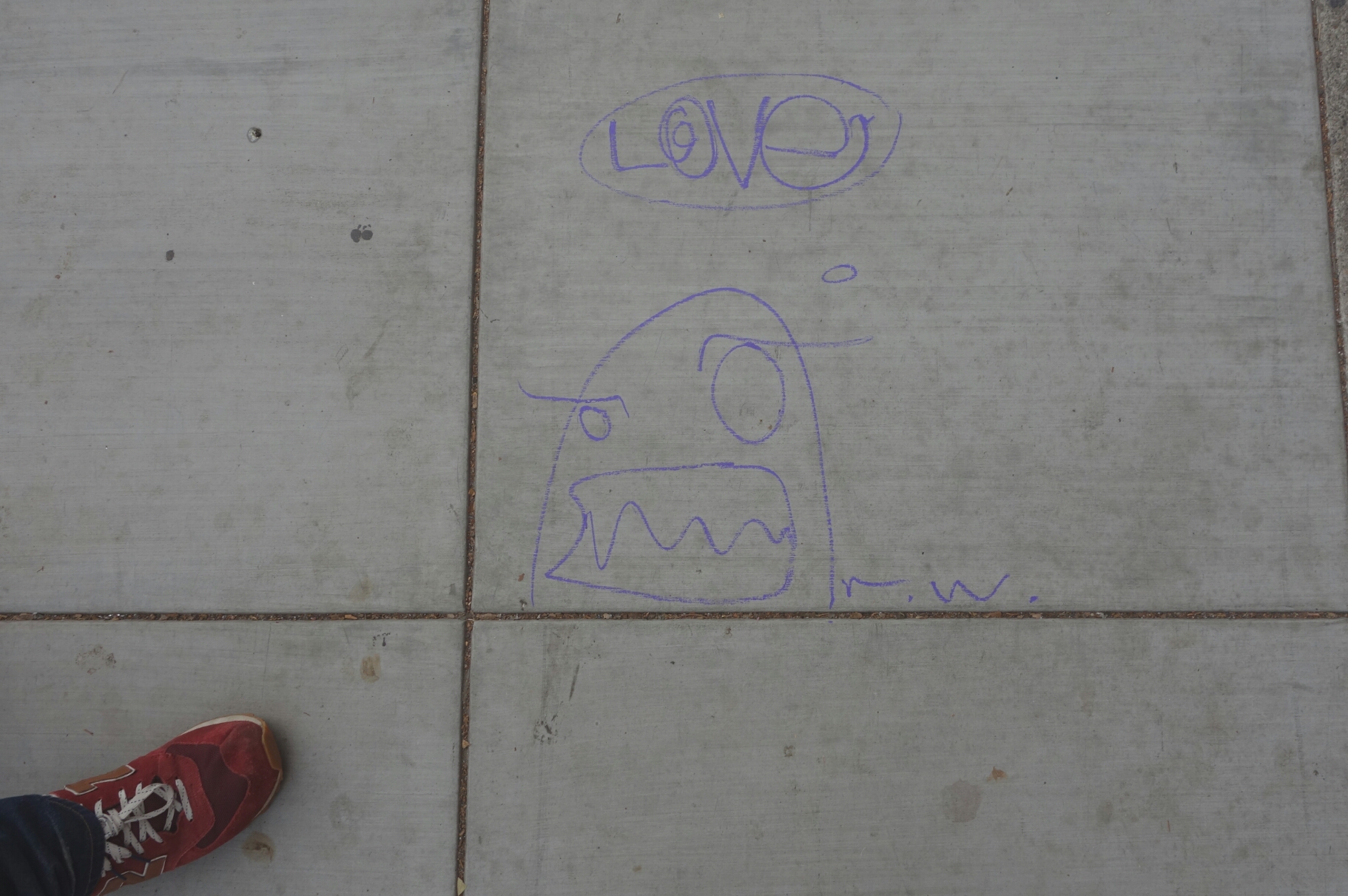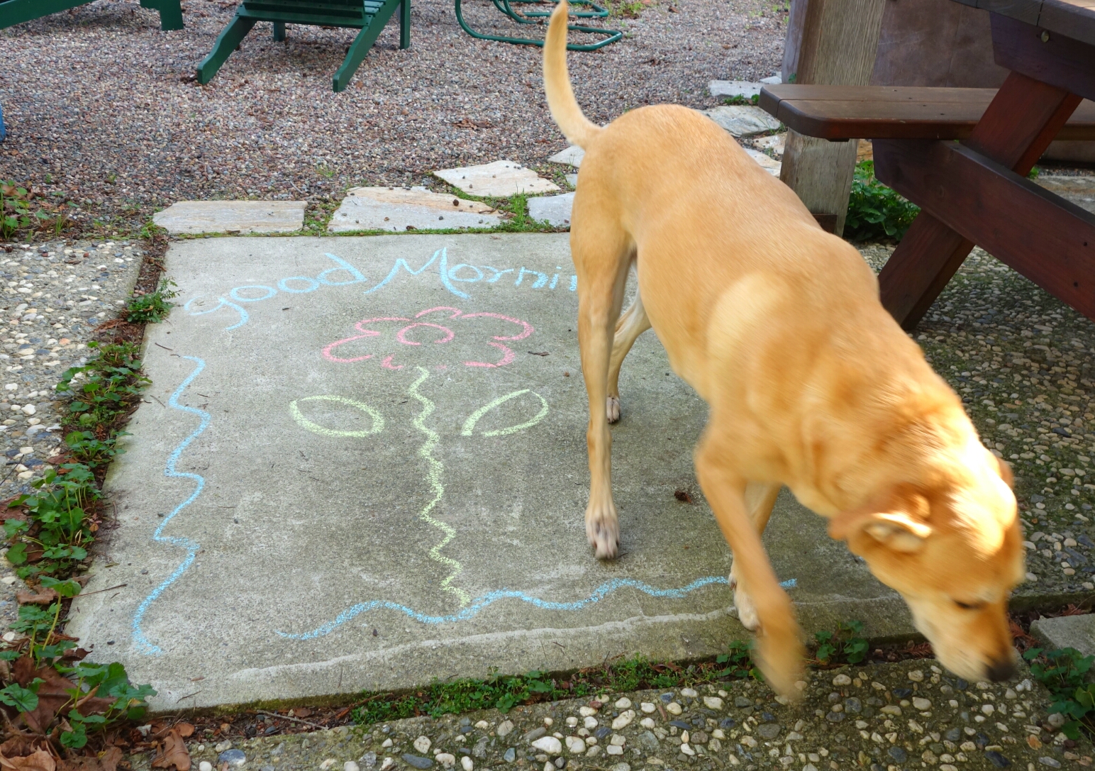 I was met by this chalk graffiti every morning as I went out to the garage. It really brightened my day. The dog that isn't pausing to pose in this photo is Gerogia, David's dog.