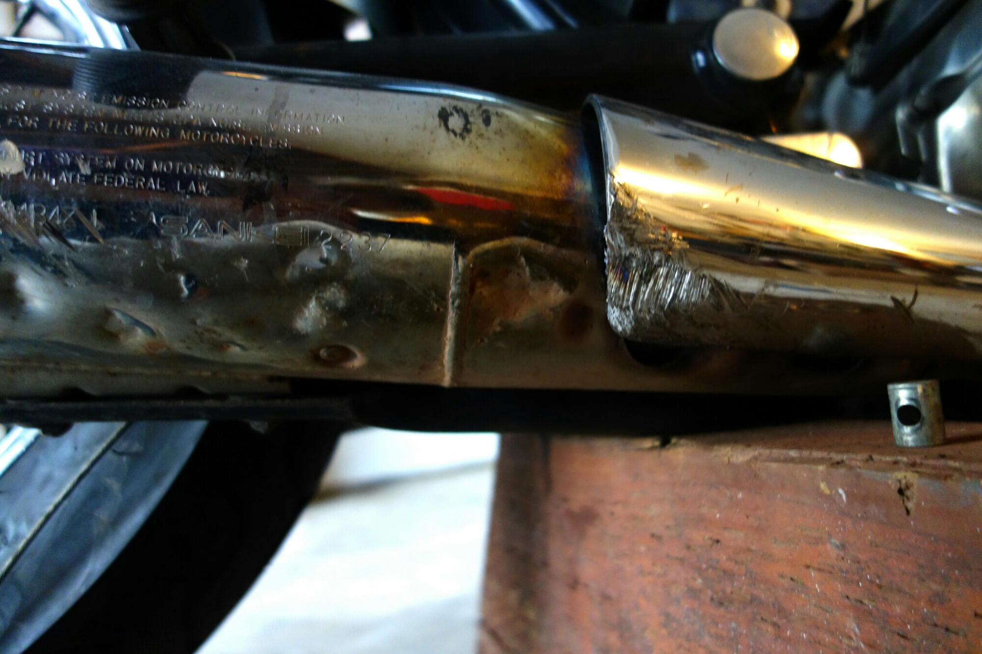 The drilling and tapping (making the wrinkles for the threads of a bolt to screw into) of the rod had to be done at Russ’ place on his drill press. I went back to his garage with him, and watched the machinist set to work. After the task was complete we took the small rod back to Chuck’s where Little Wing waited patiently. I then watched, with great trepidation, as Russ tapped the head of the bike. That is no little thing. The engine of my bike was being changed, in just the slightest way, but it was still being changed. I worried, and I feared, and I thought ‘what if’ and I thought ‘should of’. I thought all the usless thoughts and during that time Russ finished adding wrinkles to the inside of the head hole. Well, there was nothing to do after that but insert the steel rod. I had already changed the head this much, why not add a foriegn object to the mix? I had to keep reminding myself that there was already a foriegn bolt end in the bottom of the hole which I broke off. I really had no place to complain about the machinist fixing the situation.