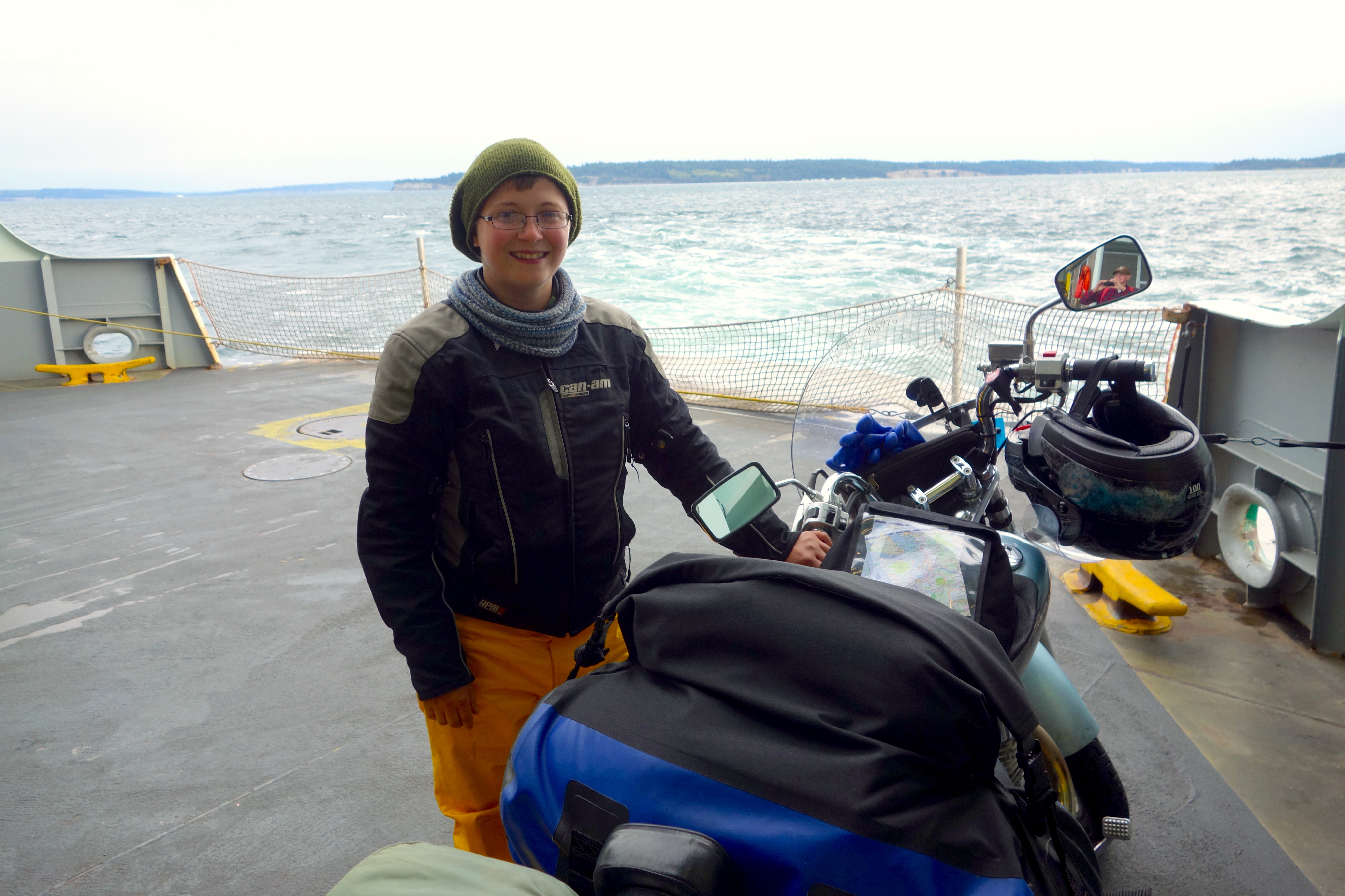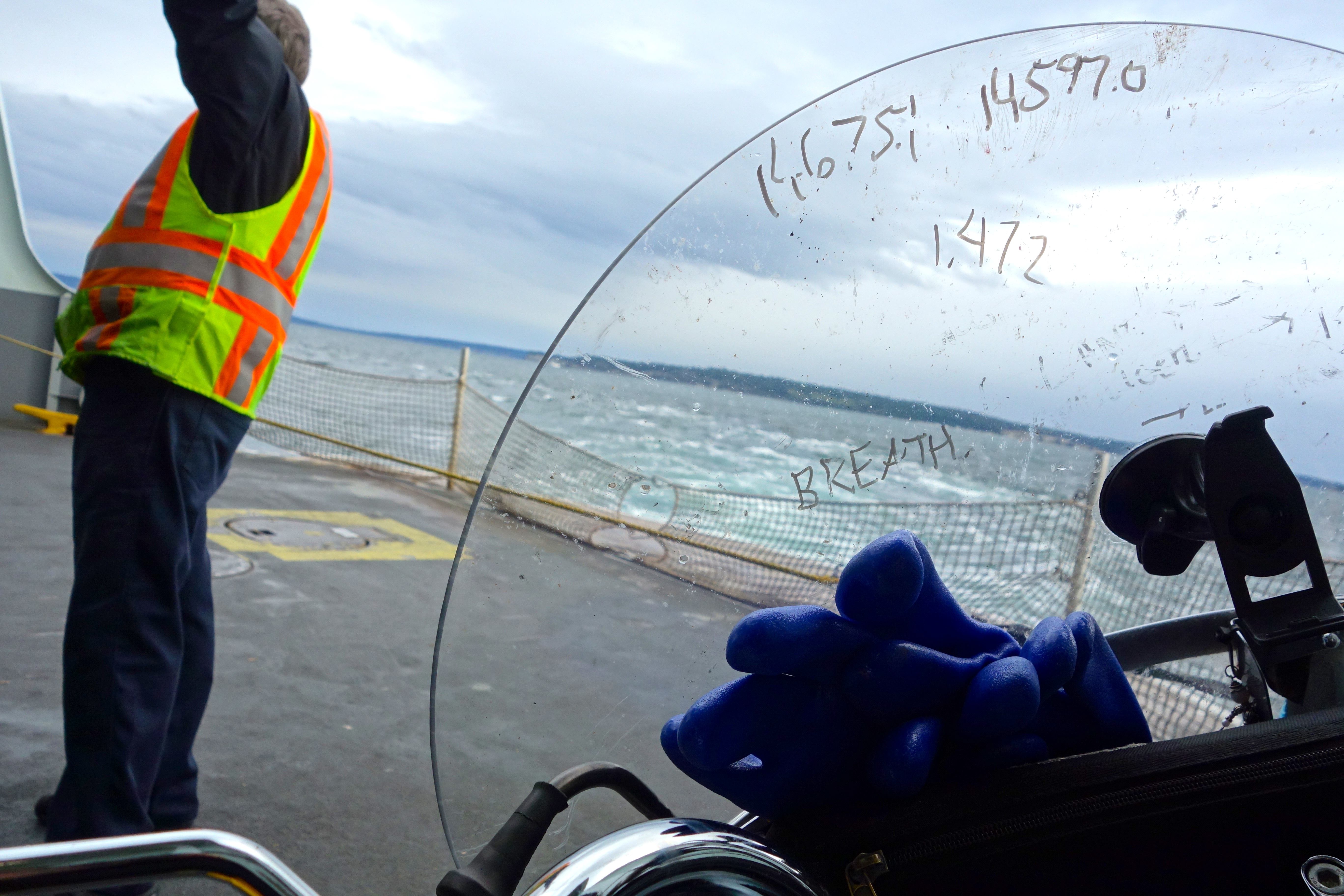A picture captured by a gentleman who also rode motorcycles. He was in a car (I was the only rider on a motorcycle on that ferry), but he owned a bike. We chatted for a bit, he gave me some advice, and then I asked him to capture a picture of Little Wing and myself. That is his face in Little Wing’s right hand mirror.
