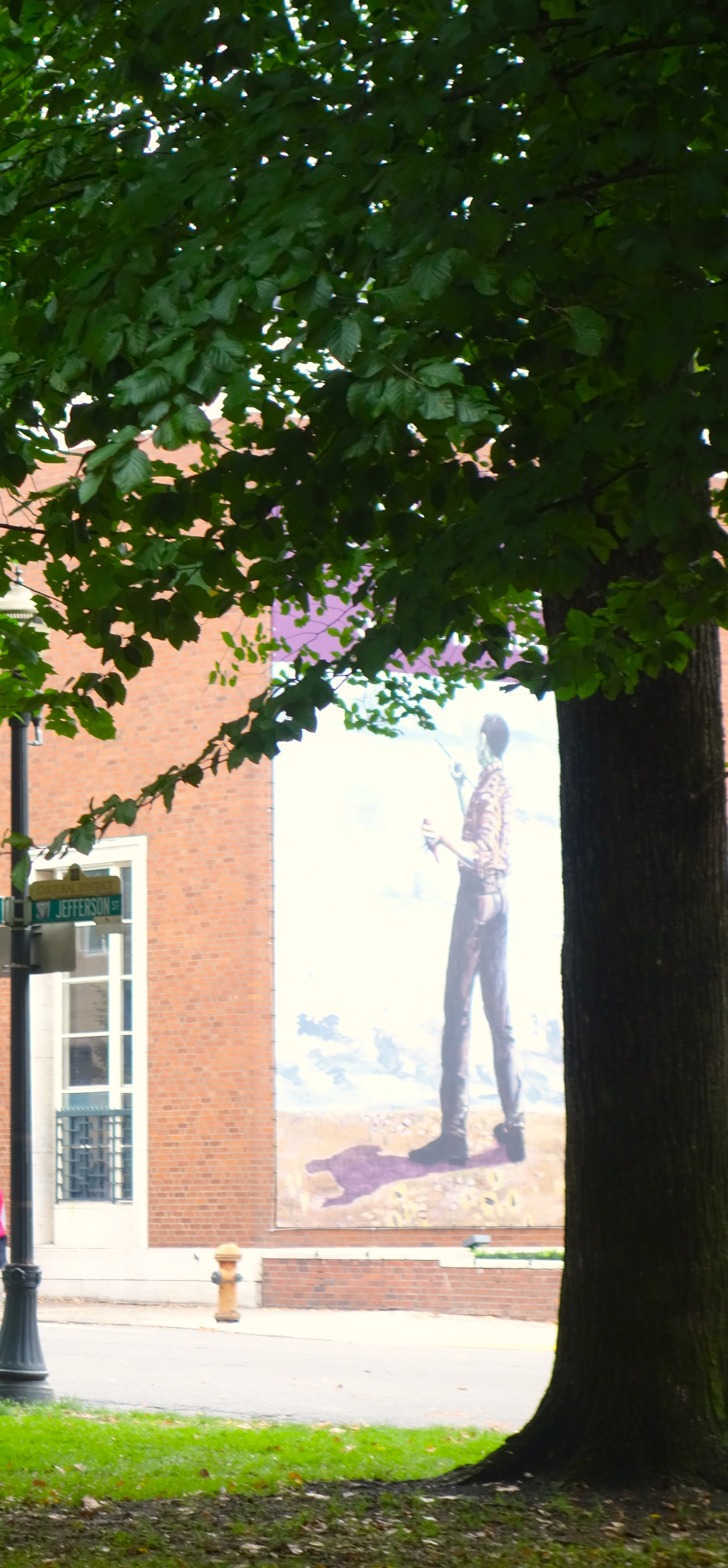 This painting was beautiful inside the museum. In the actual painting he is gripping a redbird and painting the clouds. in the picture he appears to be painting the tree. The tumbling naked woman is in front of him.