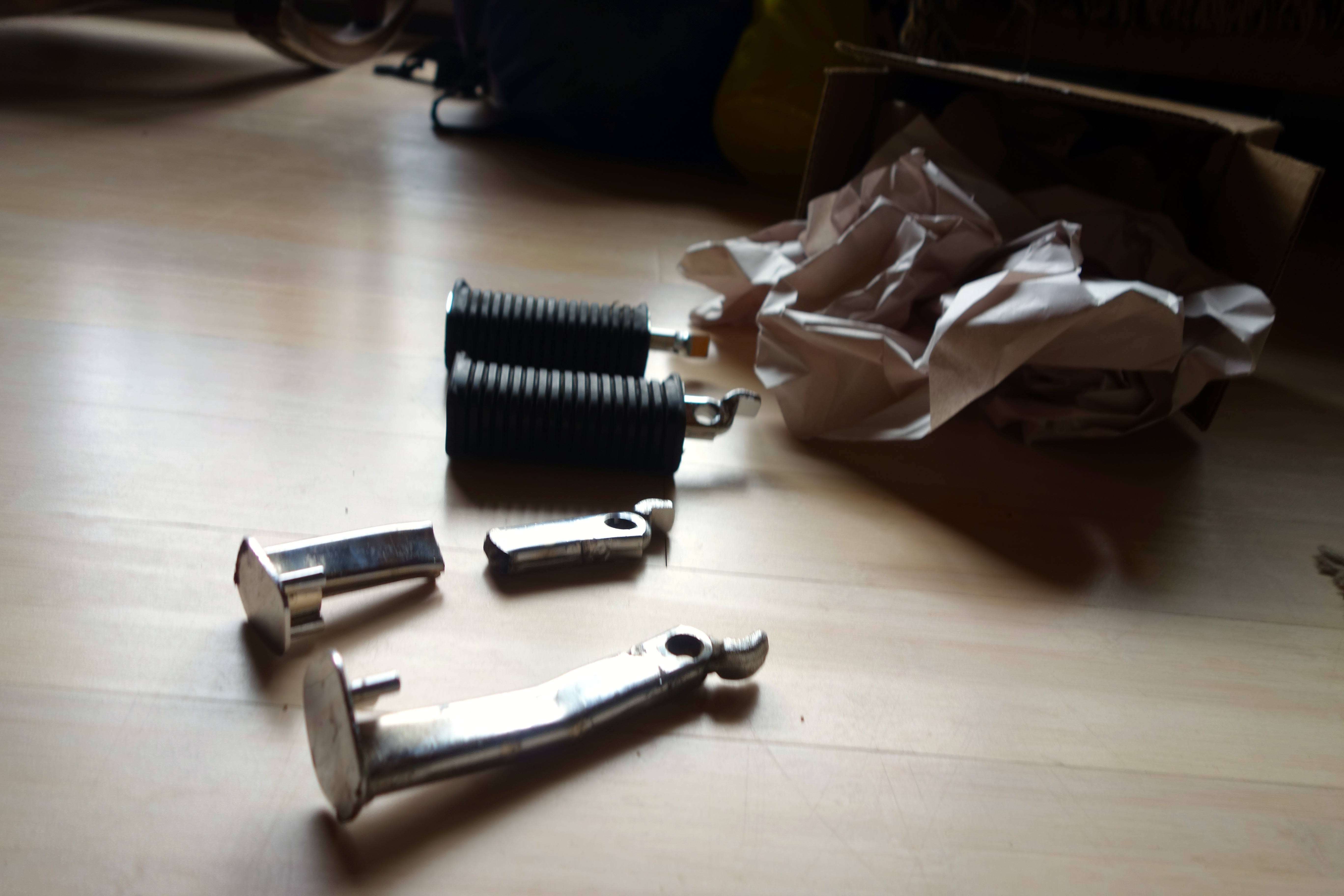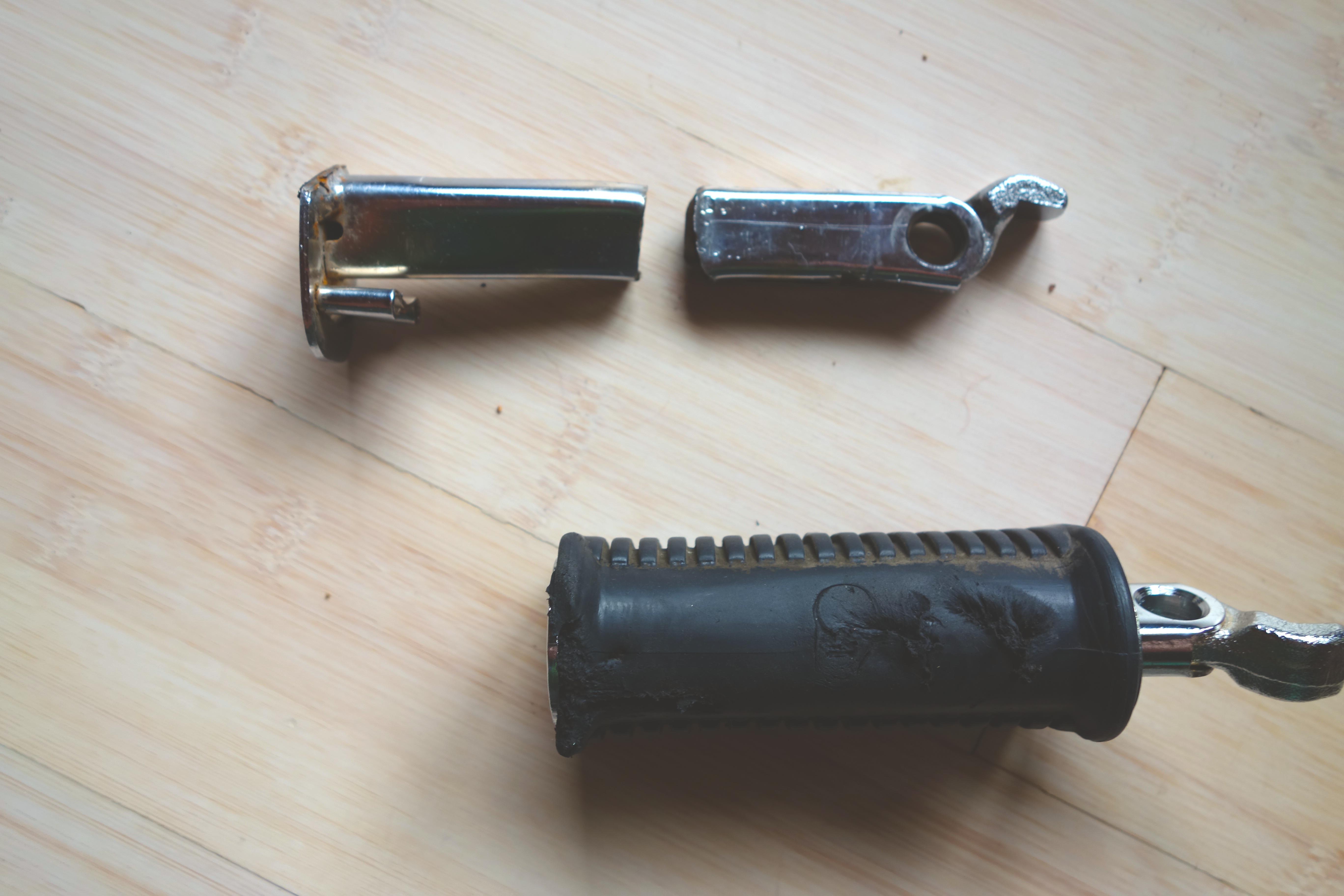 Little Wing’s busted footpeg. The broken bar and the scratched up rubber piece, which is already on the new bar in this picture.