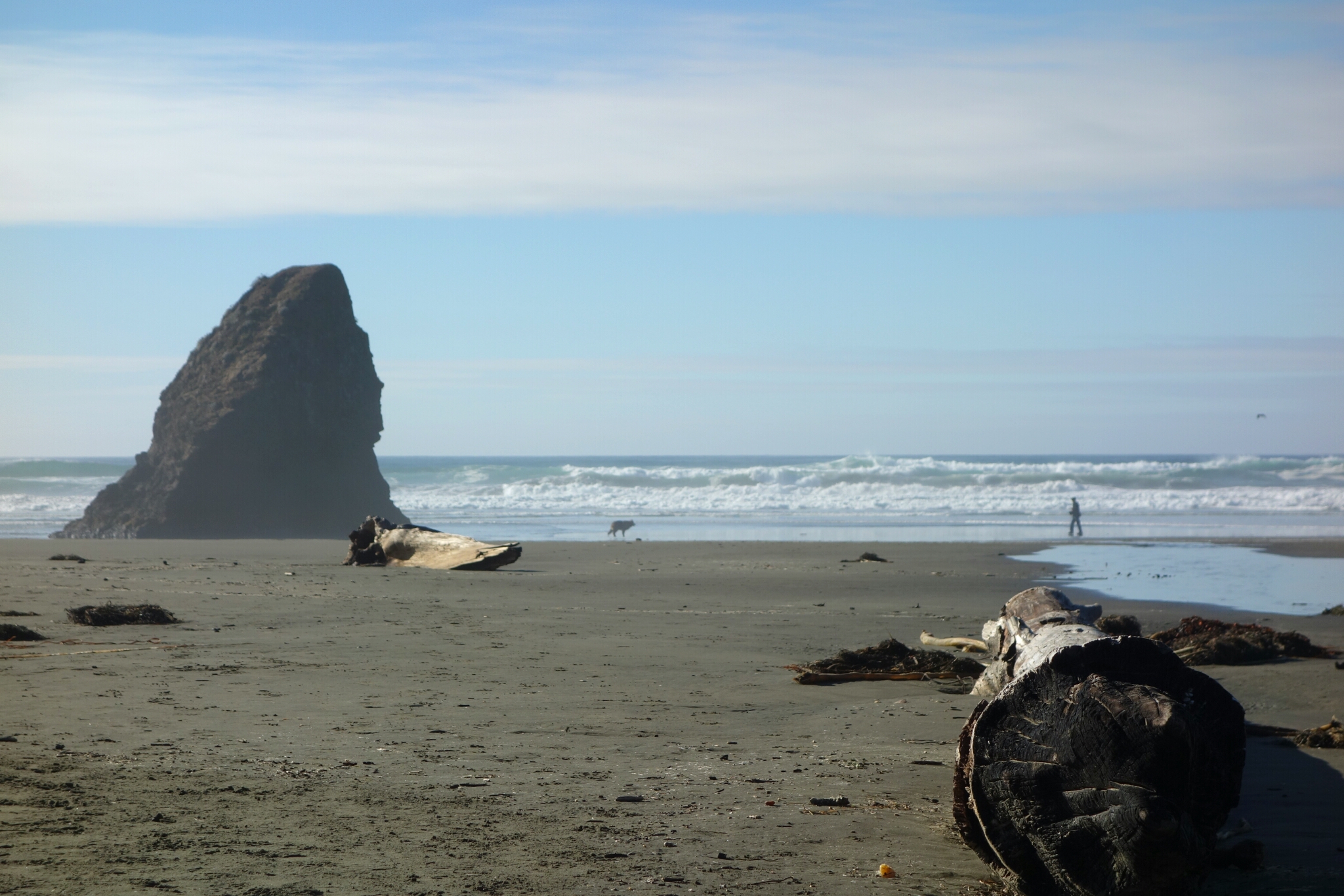 This image of this owner and his dog appears to be a moment of play between the two symbiotic creatures. In fact, the owner was tossing a stick for the dog, but after he tossed the twig he would attempt to capture a shot of the magnificent canine running into the surf on his camera. So this picture is actually a photograph of a photographer photographing on the Pacific.