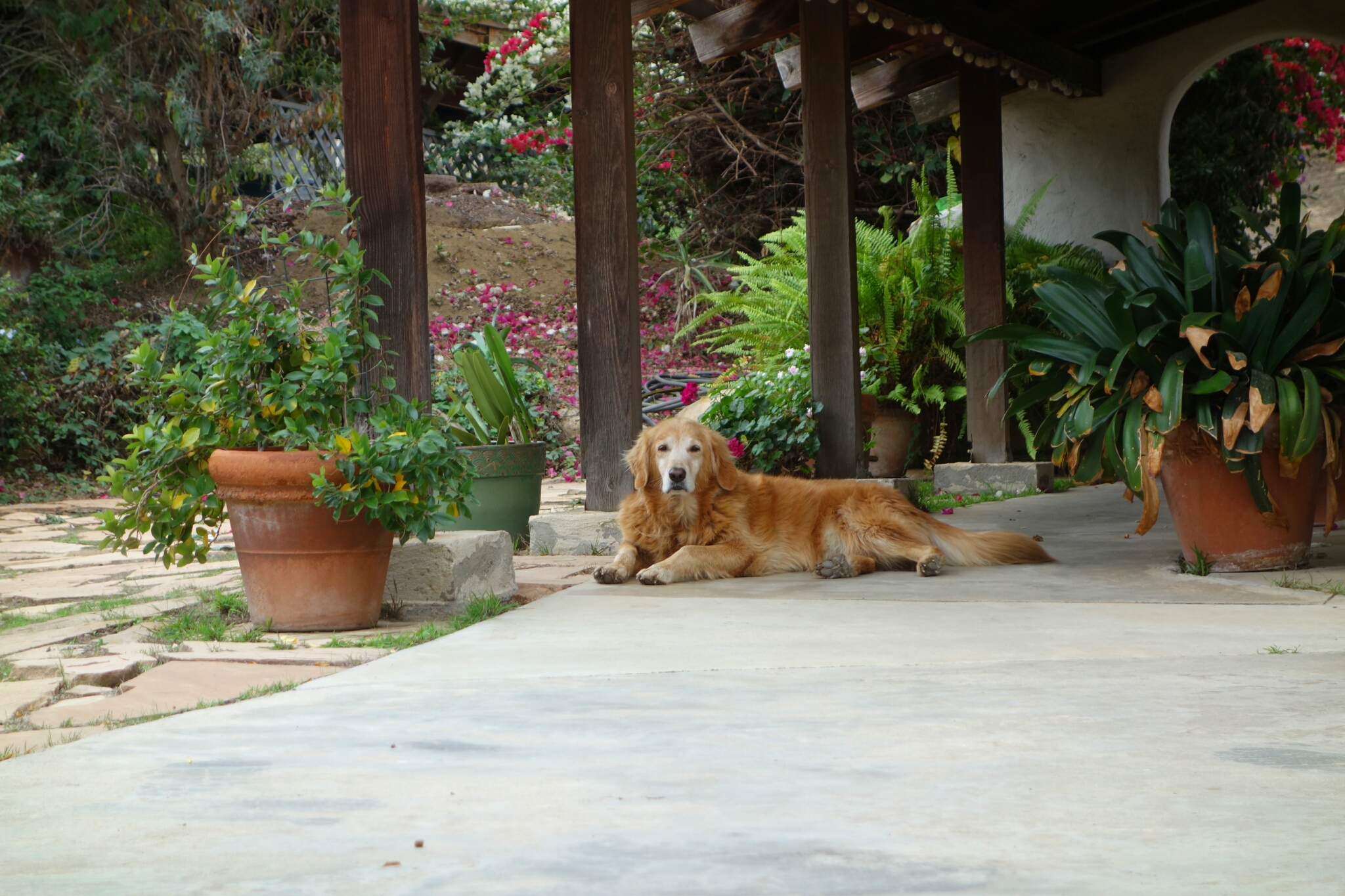 My host in Oceanside has two dogs, but the way the neighborhood works around here it seems all the dogs are shared. In this peaceful hilltop agricultural portion of the community the dogs sort of wander from house to house (in and out of open doors in the warm climate) and graze on food and human love as they go. This dog is Boxey. In reality she belongs to my host, but she is a pet to many.