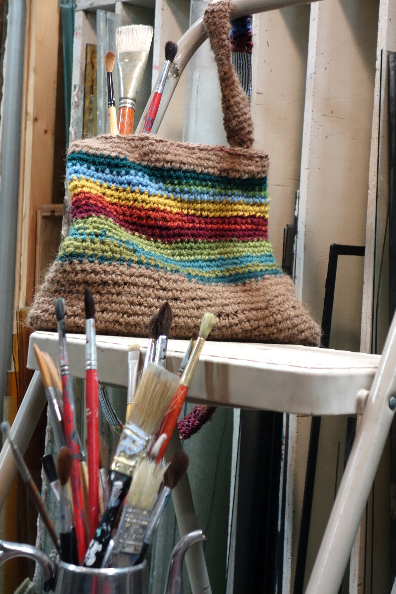 This bag has been a project for awhile. I as in need of a going-to-town bag for when I left my motorcycle parked so I crocheted one using scraps and a beautiful yarn I recieved from my host with the Alpaca ranch in Wyoming. The brown yarn is her hand grown, sheared, carded, and spun stuff. Makes for a great bag.